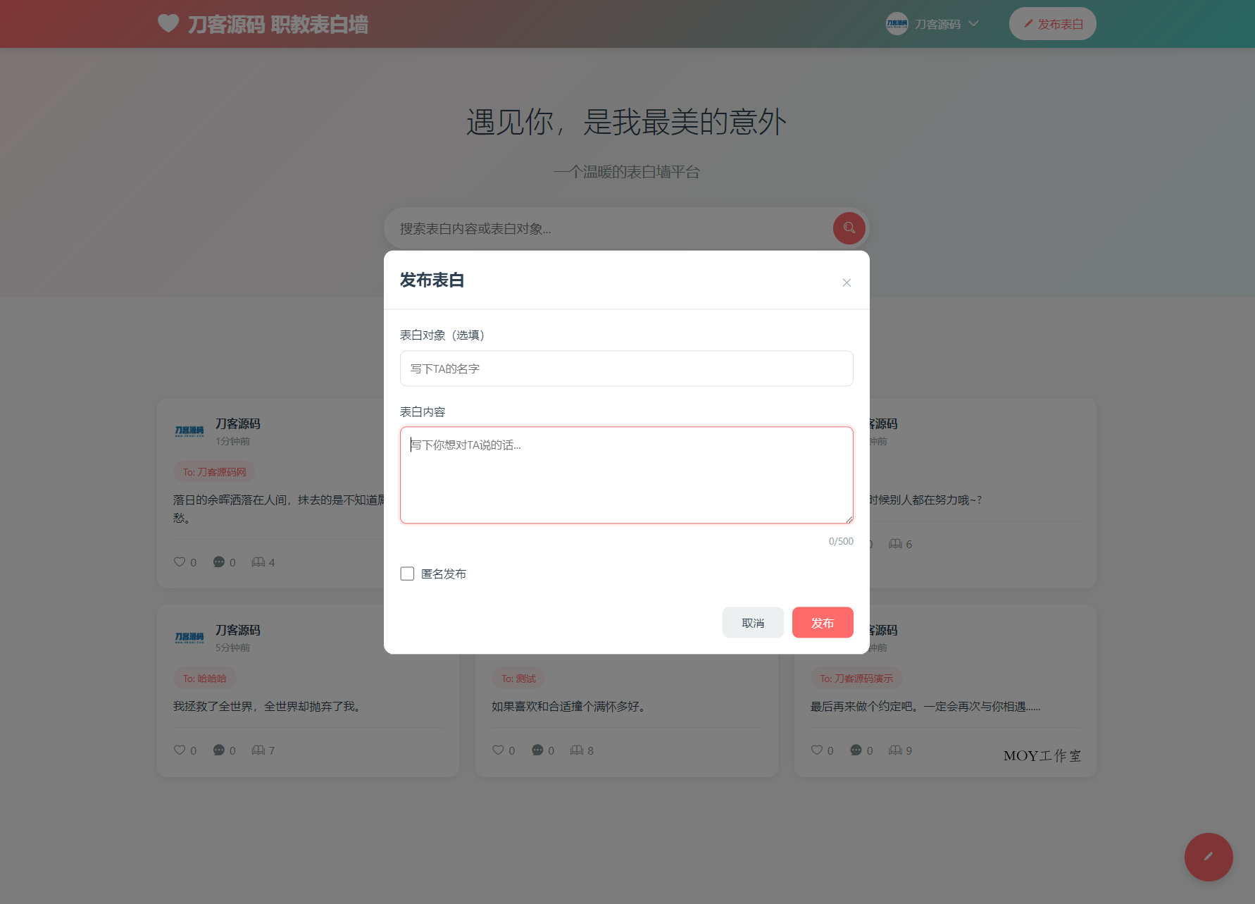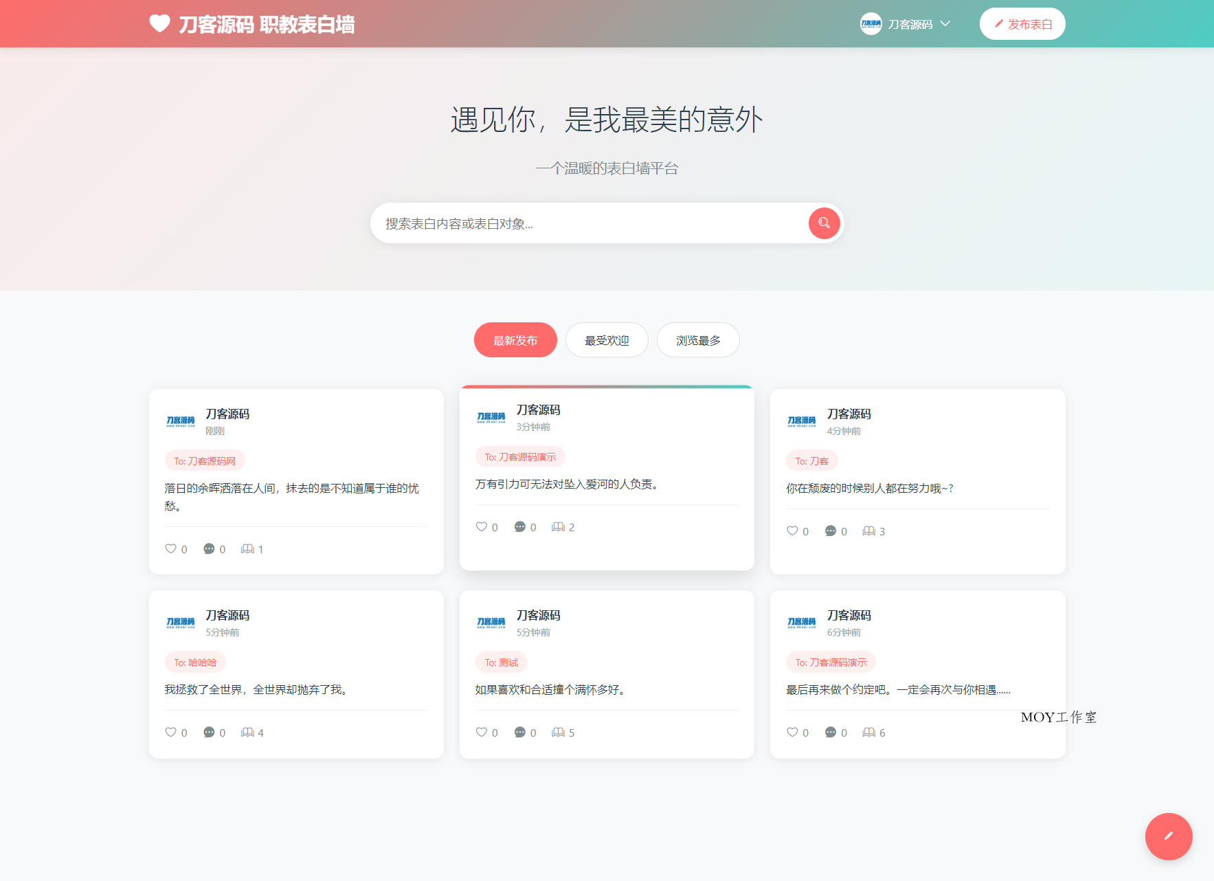 最新轻量美化表白墙系统源码v2.0 带后台版 附搭建教程MOY工作室4个月前更新关注私信066904414最新轻量美化表白墙系统源码v2.0 带后台版 附搭建教程此内容为免费资源,请登录后查看0积分 登录查看免费资源 简介: 最新轻量美化表白墙系统源码v2.0 带后台版 附搭建教程 更新日志: 增加审核功能,增加了后台管理 增加了用户中心,使用了全新UI界面 图片: © 版权声明文章版权归作者所有,未经允许请勿转载。THE END脚本源码 喜欢就支持一下吧点赞4414赞赏 分享QQ空间微博QQ好友海报分享复制链接收藏